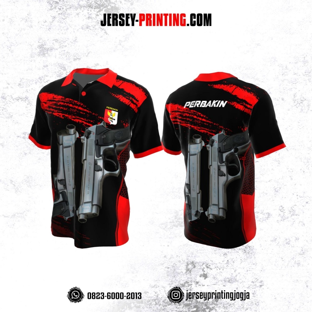 Baju Kaos Jersey Menembak Perbakin Kerah Polo Hitam Merah Abu-abu Motif Brush